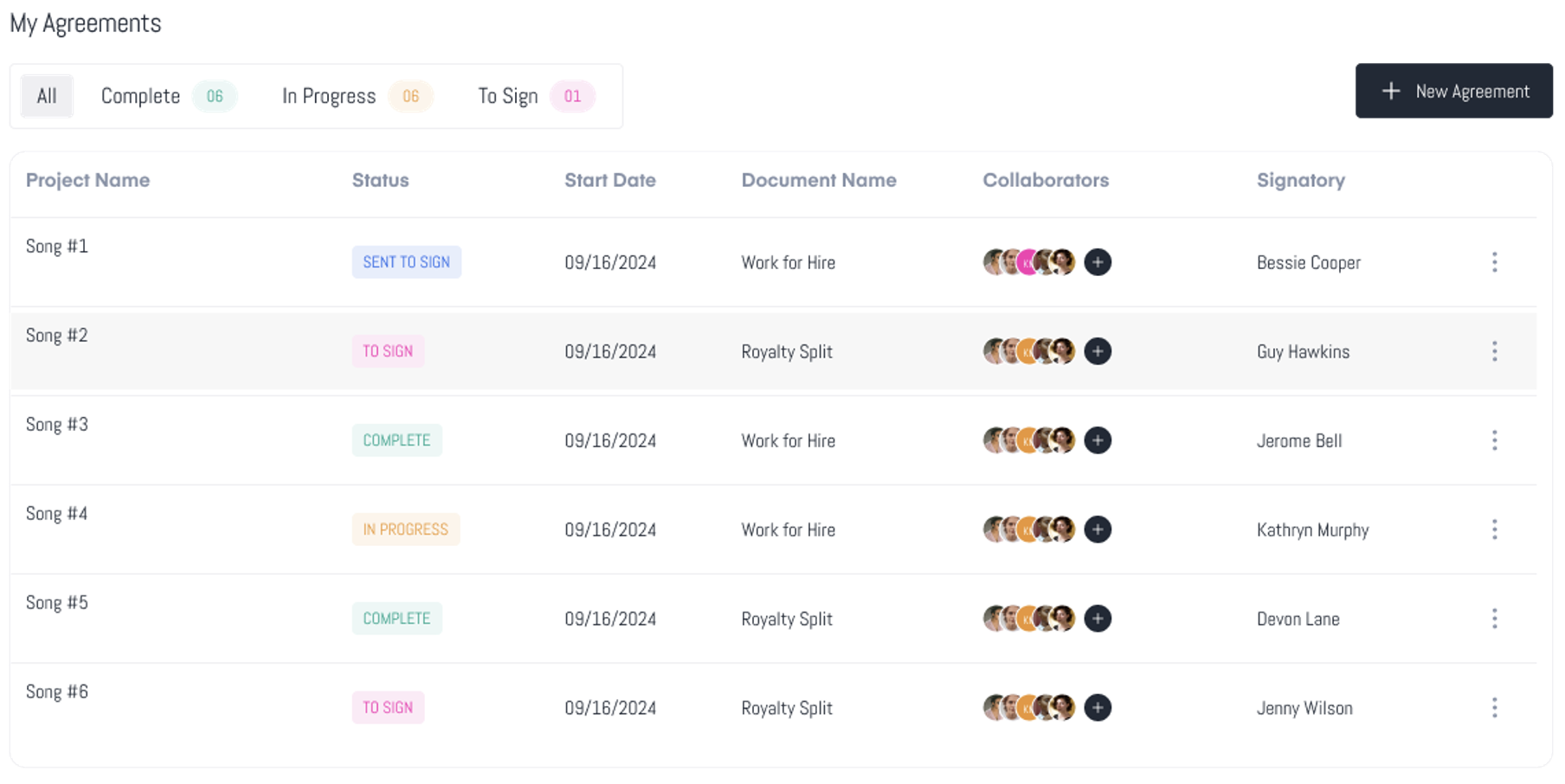 - Collaborators: The initials or names of collaborators involved in the agreement help users identify who else is involved.
