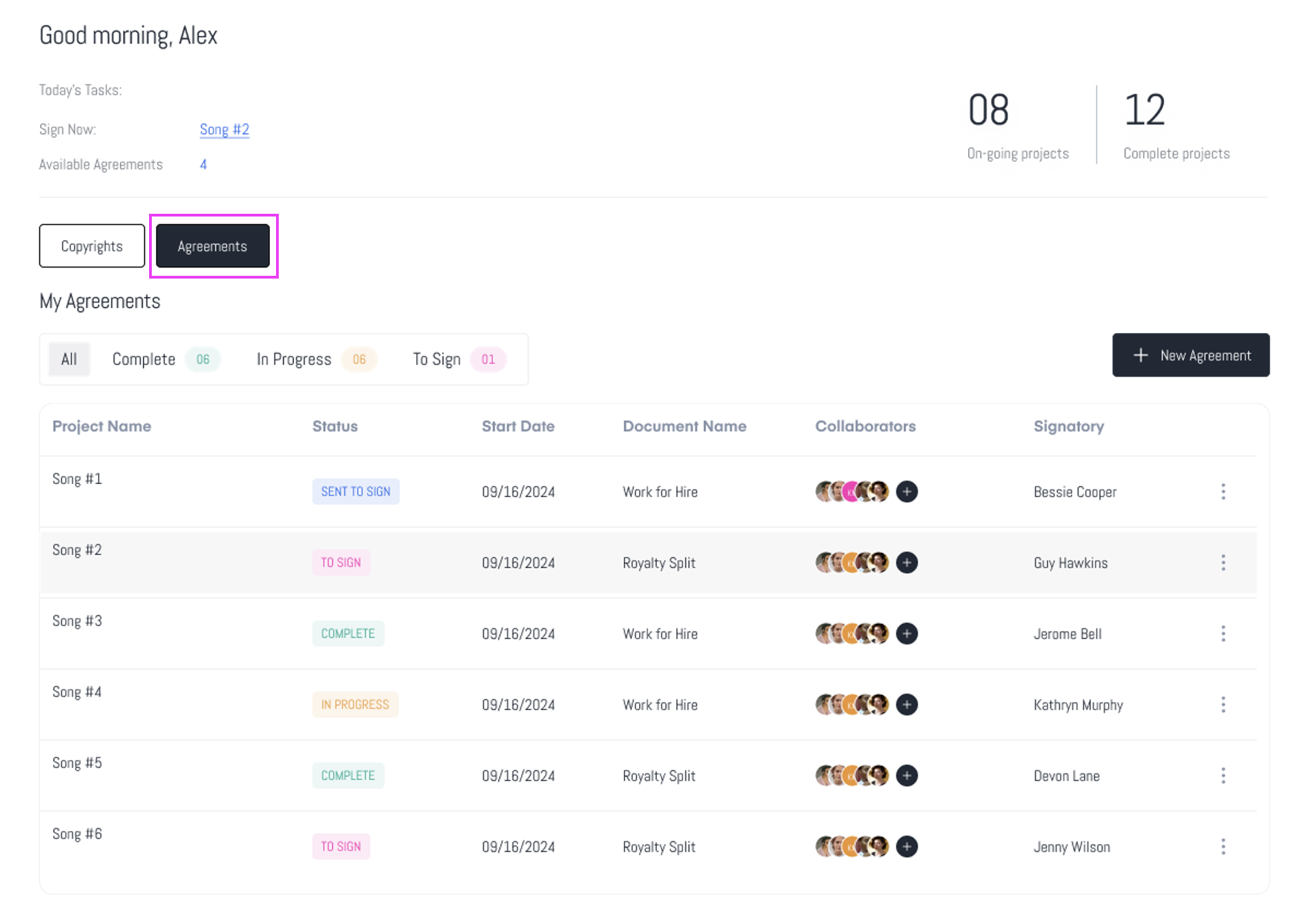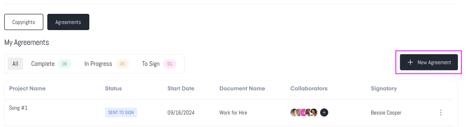 - You'll be directed to the agreement overview page once you've selected the agreement type and collaborator role.