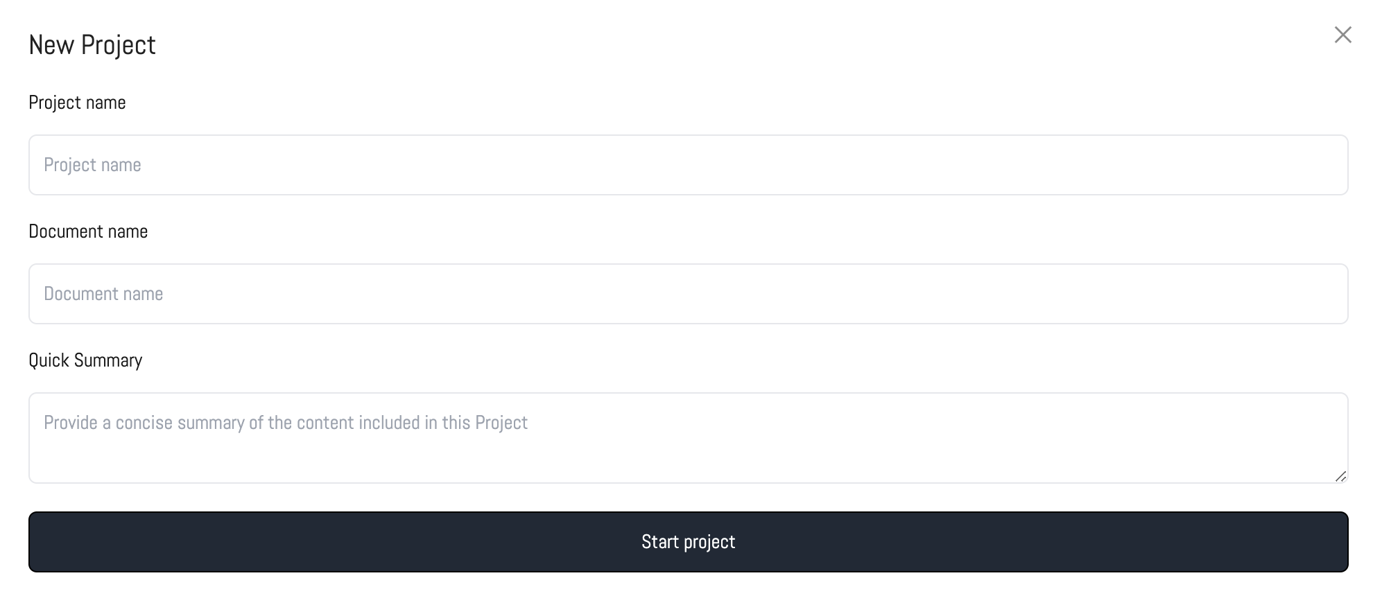 - This will launch the "New Project" window. You will input the "Project Name," "Document Name," and a quick project summary here.