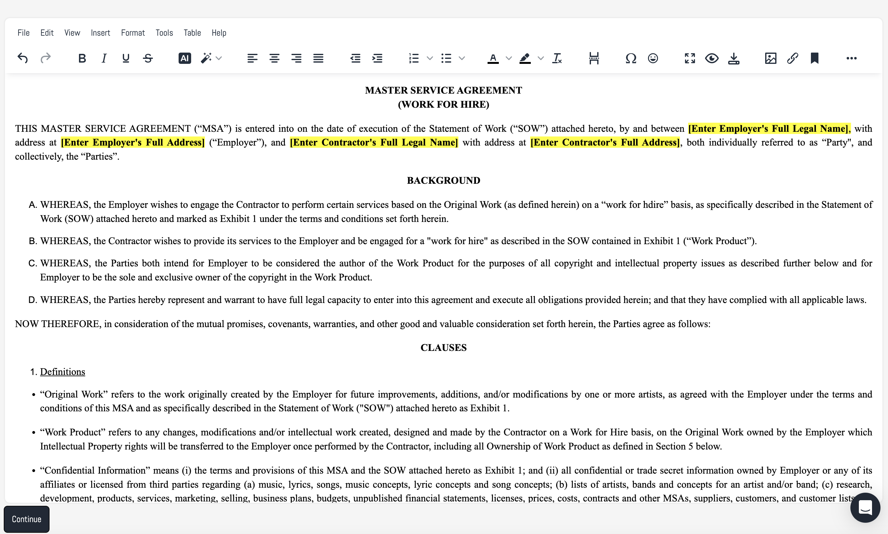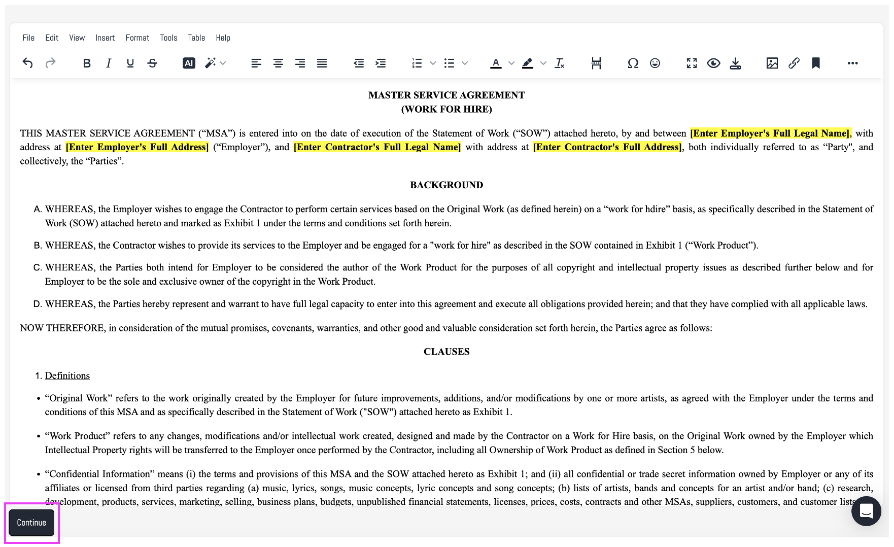 Next, you’ll enter the collaboration space, where you can invite collaborators, leave comments on the agreement, and more. Click here to learn more.
