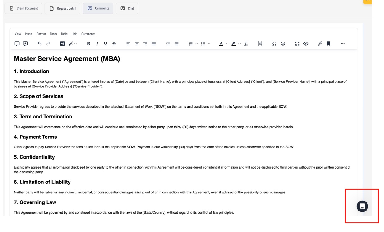 CHAT FEATURE: To ask general questions, we recommend our chat feature. This tool allows you to seamlessly communicate with your Lawyer about general agreement details, questions, etc. This tool is available at all times in your collaboration space.